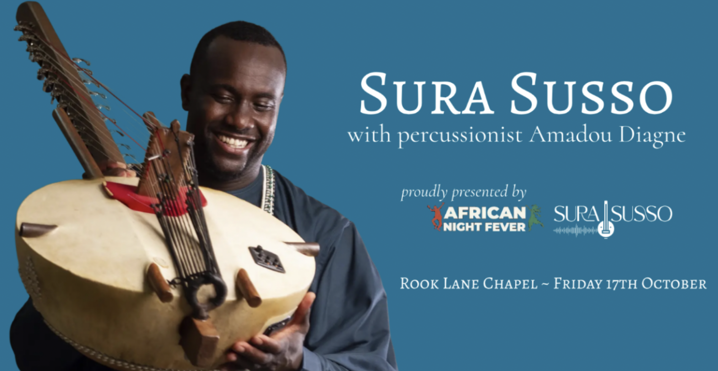 Step into a world of rhythm, soul and cultural richness with Sura Susso, the internationally acclaimed kora virtuoso, joined by formidable percussionist Amadou Diagne. Audiences across the country have described their live performances as ‘magical, uplifting, and utterly unforgettable’ – and now is your chance to experience it live at the stunning Rook Lane Chapel in Frome!